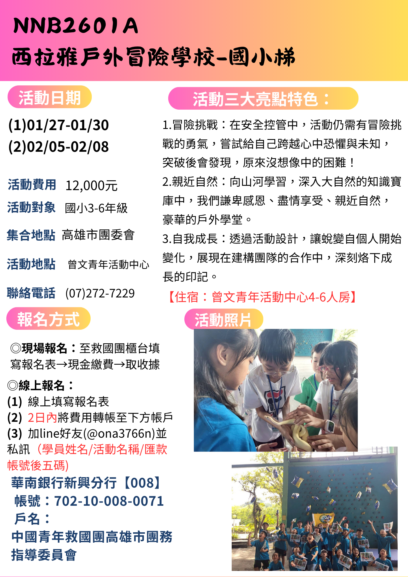 【高雄市救國團115年冬令營】NNB2601A西拉雅戶外冒險學校(國小梯)