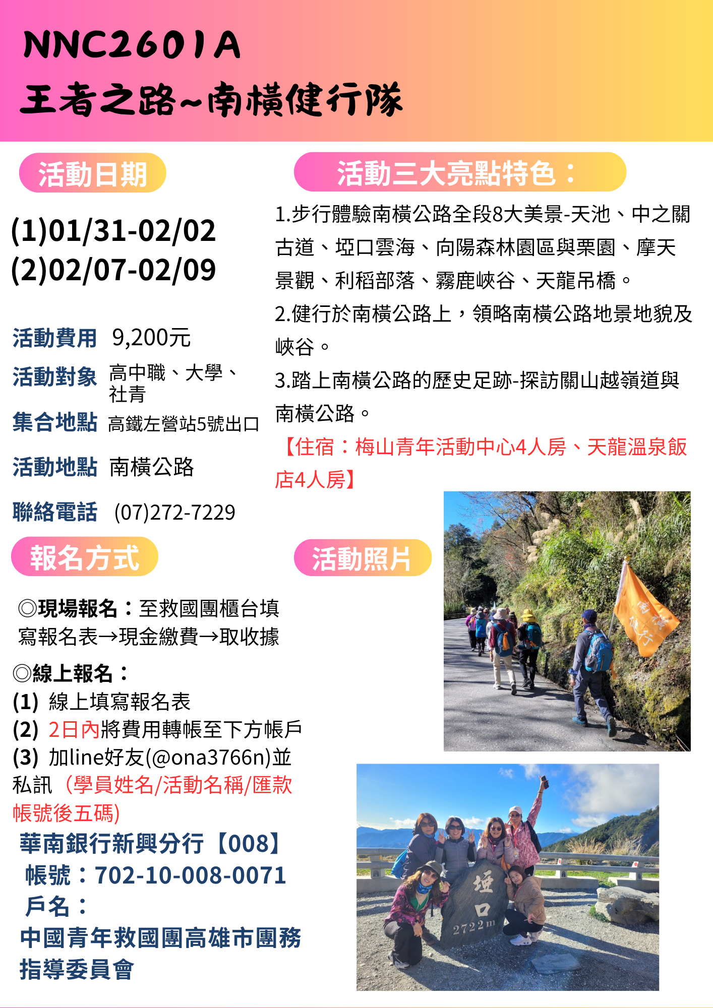 【高雄市救國團115年冬令營】NNC2601A王者之路~南橫健行隊