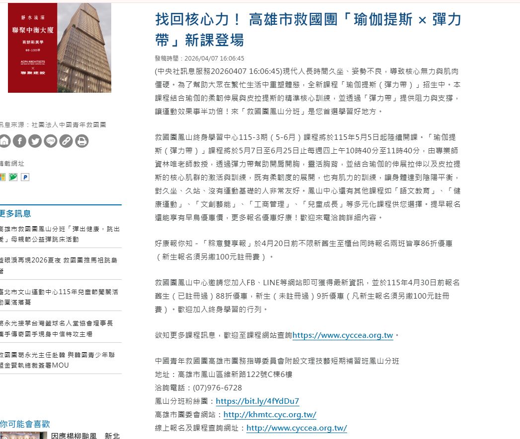 【救國團課程訊息】115-3期(5-6月)救國團鳳山中心~找回核心力!「瑜伽提斯 × 彈力帶」新課登場