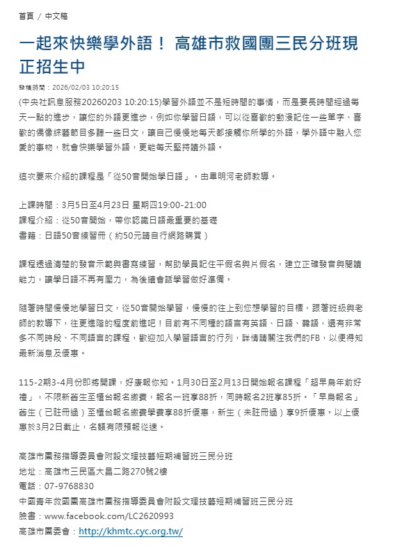 救國團三民終身學習中心115年第2期 一起來快樂學外語!救國團三民分班現正招生中